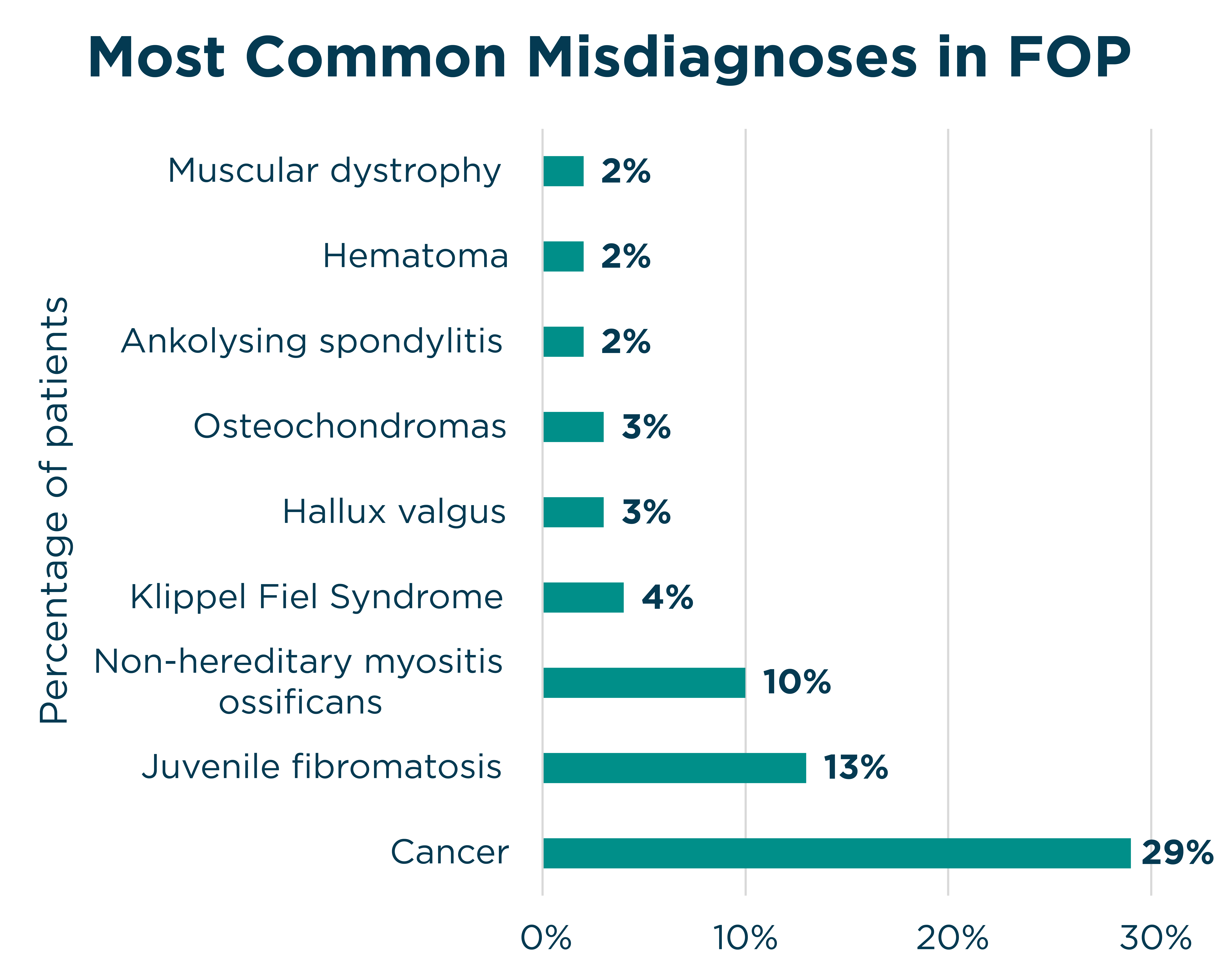 More than half of people with FOP have been misdiagnosed, with it taking an average of 1.5 years to reach a correct diagnosis.1