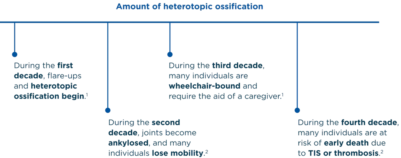 1. Kaplan FS, et al. Proc Intl Clin Council FOP 2022;2:1–127; 2. Smilde BJ, et al. Orthoped Res Rev 2022;14:113–120; 3. Ortiz-Agapito F, et al. J Child Orthop 2015;9:489–493.